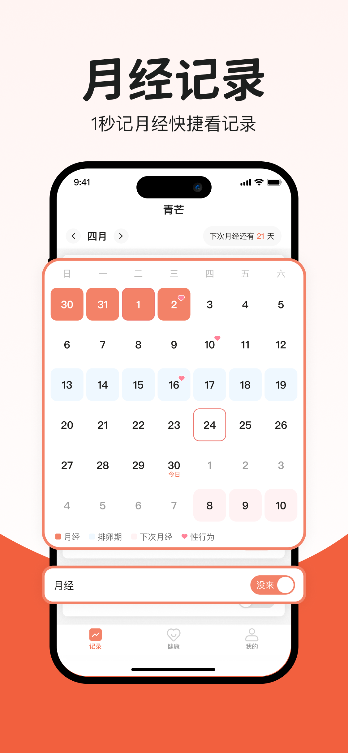 1 秒记录经期,清晰分析周期变化,辅助备孕与避孕,轻松管理女性健康。